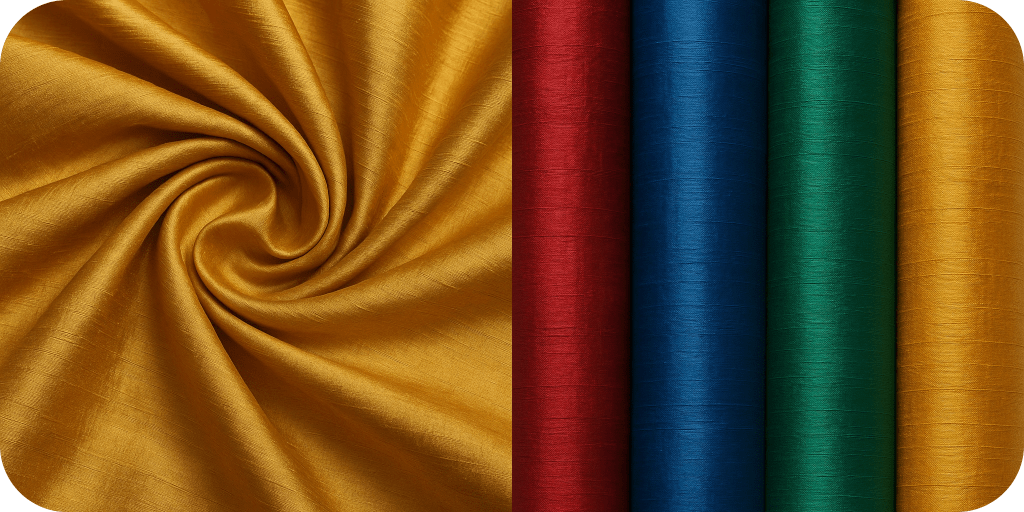 Dupion silk (also spelled Douppioni, Dupioni, or Doupion) is a type of silk fabric known for its unique texture and elegant sheen. It’s made from two silkworms that spin their cocoons closely together, causing the silk threads to become naturally intertwined. This process creates irregular, slubby threads, which give dupion silk its signature crisp texture and subtle sheen.